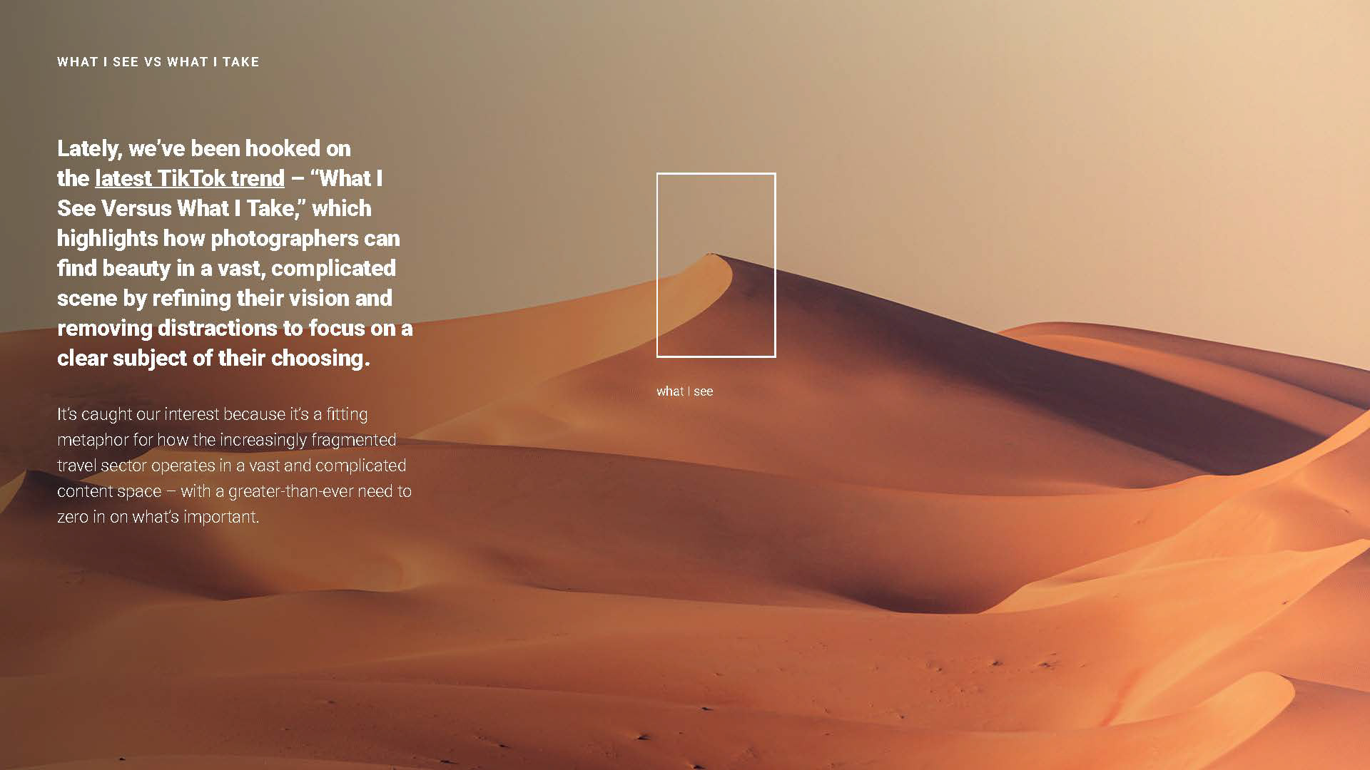 SabreMosaic’s inaugural white paper tackles a core challenge in the travel agency ecosystem: fragmented, multi-source content. To visualize this problem, the study draws inspiration from a popular TikTok photography trend, “What I See vs. What I Take”—highlighting the contrast between raw perception and curated focus. This metaphor helped frame the narrative around how travel content is experienced versus how it’s delivered.